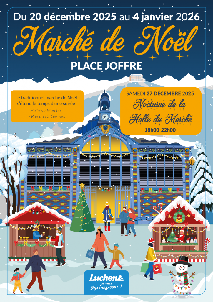 Marché de Noël du 20/12 au 4 Janvier 2026. Les petits chalets seront installés Place Joffre, devant l’Eglise.