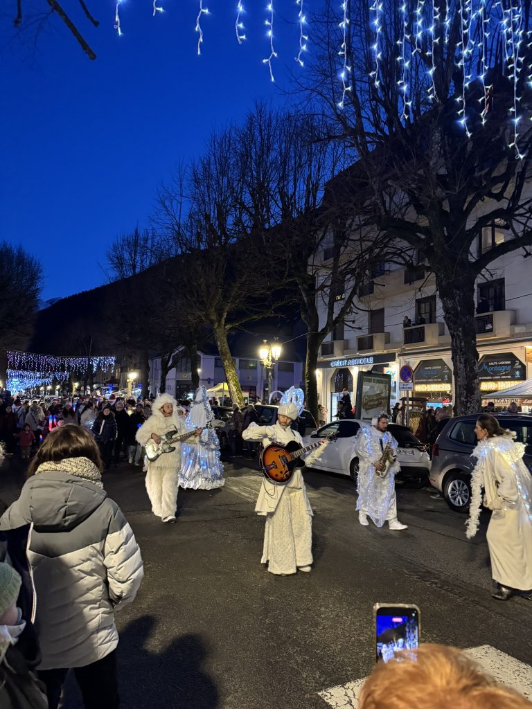 Les Allées d’Etigny grouillaient de monde en cette fin d’après-midi de dimanche 28 décembre. Tous venus découvrir la toute première parade offerte par les associations de la ville. Descente des Allées, terminée par un spectacle proposé par les élèves des groupes Mebaniah, Le Quadrille Luchonnais et Paralelle. Malgré leur grand age, les belles voitures étaient là aussi, précédées des chevaux et des enfants du Centre Equestre, le Ski Club Luchon Superbagnères avait lui aussi dépèché ses membres compétiteurs pour porter les flambeaux. L’association des commerçants, les Fils de Luchon étaient aussi représentés…Toutes ces silouhettes illuminées, suivaient le char couvert de feux multicolores, décoré par les jeunes de la MJC, ouvrant le défilé jusqu’à la place Joffre. La mascotte « Charlotte » et d’autres offraient à chacun un message de voeux pour cette fin d’année.