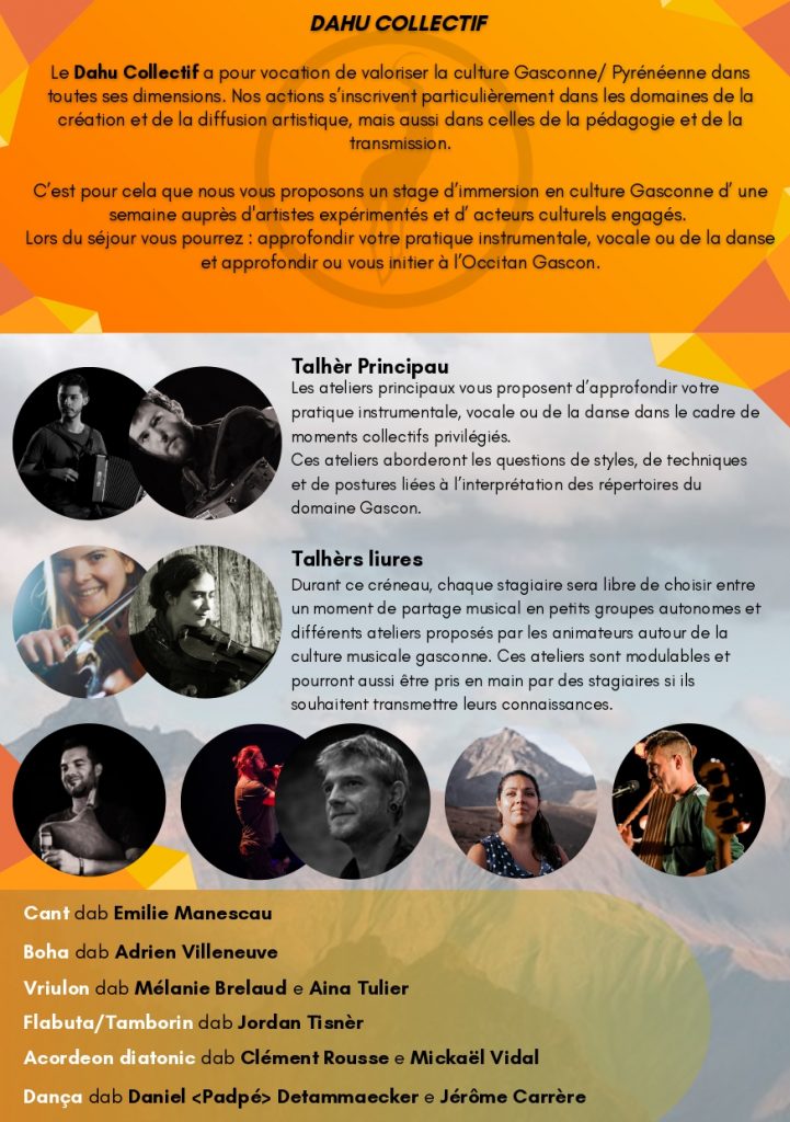 Pratiquer ou découvrir l’Occitan Gascon, développer la pratique de son instrument, du chant ou de la danse. Au choix un atelier principal :