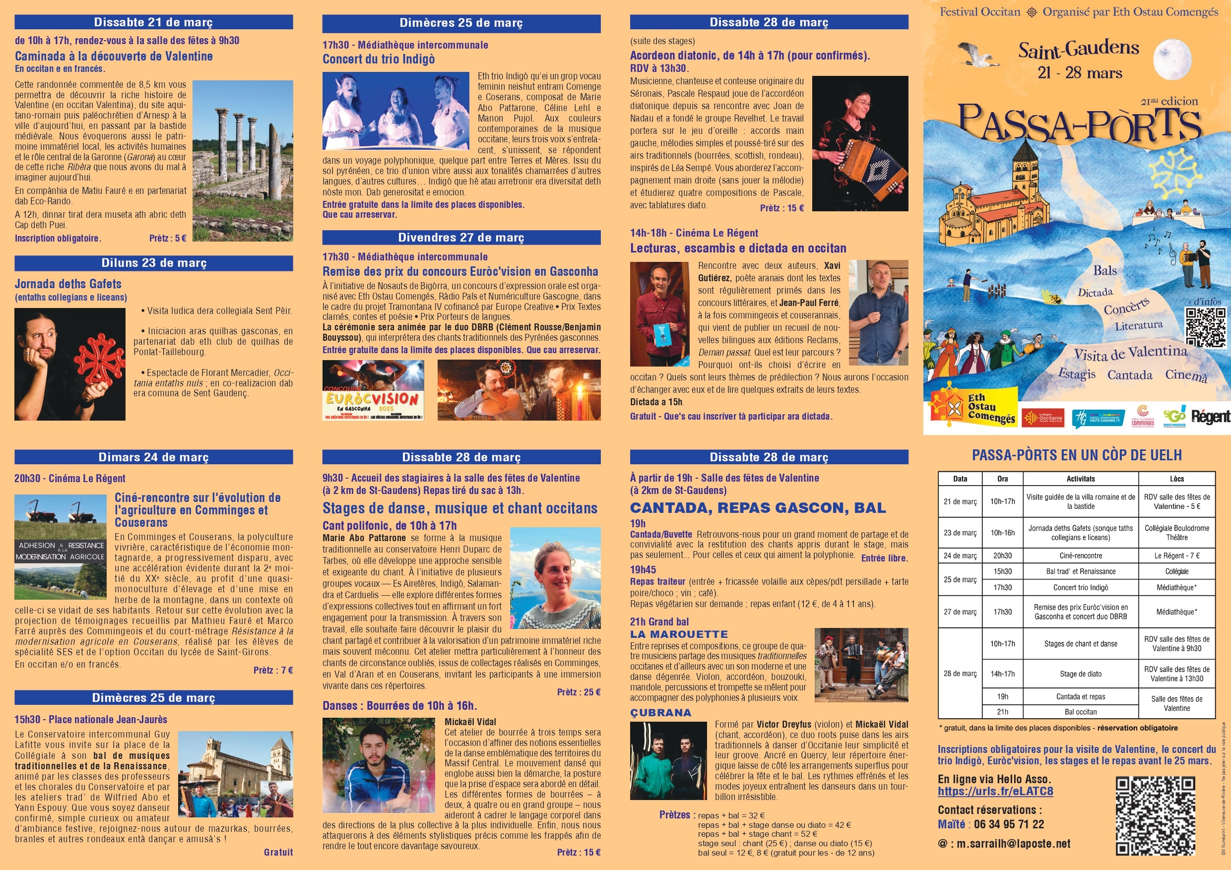 Passa-Pórts un Festival inscrit depuis 2004 dans le paysage printanier du comminges. Merci à l’Ostau Comenges de proposer, aux autoctones et à nos premiers visiteurs, de partager, découvrir, la culture commingeoise et ses richesses, quelles soient linguistiques, matérielles et immatérielles. Des intervenants venus des quatre coins de la gascogne. Cela commence samedi 21 à Valentine avec une Caminada pour découvrir Valentine accompagnée par Eco-Rando et Mathieu Fauré.